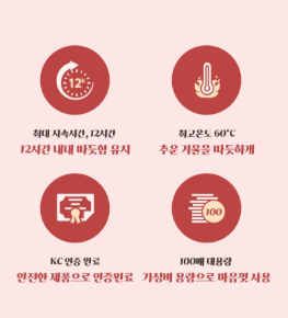 - ✔️ 하루종일 따뜻한 보온 유지 (최대 14시간 지속)
